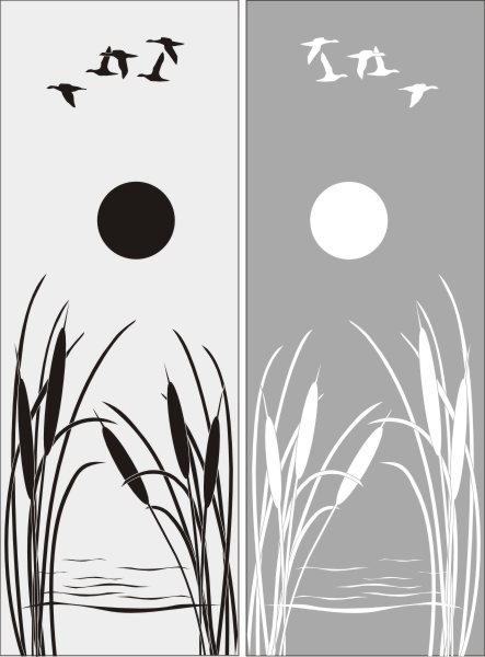 Эскиз векторного рисунка "перелетные птицы над озером". При желании в соответствующем разделе нашего сайта, Вы сможете заказать шкаф купе с этим рисунком на дверях.