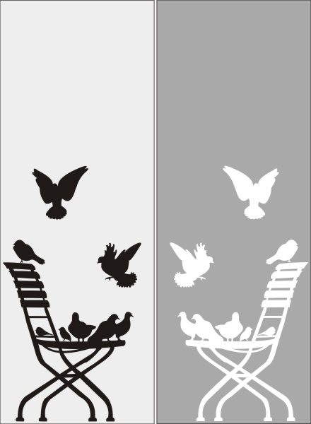 Эскиз векторного рисунка "голуби на стуле". При желании в соответствующем разделе нашего сайта, Вы сможете заказать шкаф купе с этим рисунком на дверях.