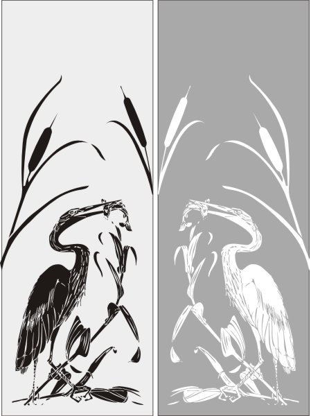 Эскиз векторного рисунка "цапля в камышах". При желании в соответствующем разделе нашего сайта, Вы сможете заказать шкаф купе с этим рисунком на дверях.