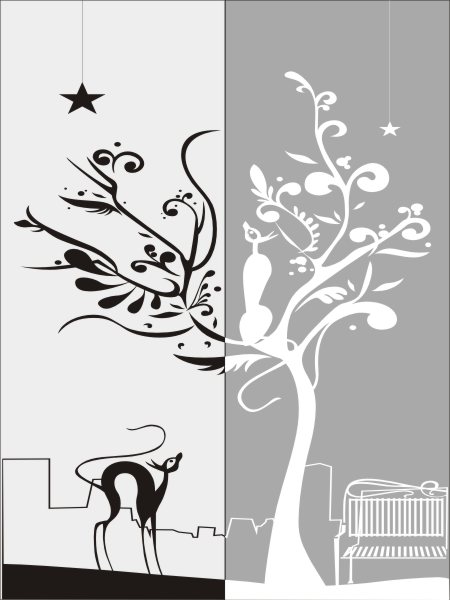 Эскиз векторного рисунка "кошки и дерево". При желании в соответствующем разделе нашего сайта, Вы сможете заказать шкаф купе с этим рисунком на дверях.