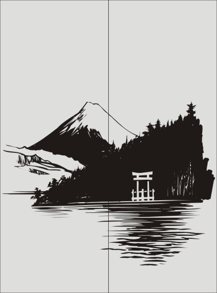 Эскиз векторного рисунка "морской пейзаж с горами у японских остравов". При желании в соответствующем разделе нашего сайта, Вы сможете заказать шкаф купе с этим рисунком на дверях.