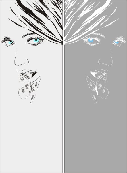 Эскиз векторного рисунка "взгляд девушки с бабочкой". При желании в соответствующем разделе нашего сайта, Вы сможете заказать шкаф купе с этим рисунком на дверях.