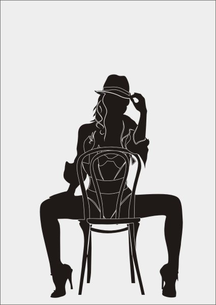 Эскиз векторного рисунка "силуэт девушки на стуле". При желании в соответствующем разделе нашего сайта, Вы сможете заказать шкаф купе с этим рисунком на дверях.