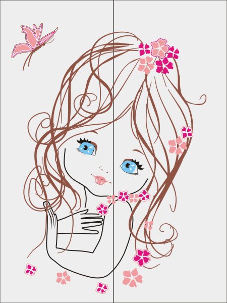 Эскиз векторного рисунка "девочка с цветами на голове и бабочкой". При желании в соответствующем разделе нашего сайта, Вы сможете заказать шкаф купе с этим рисунком на дверях.